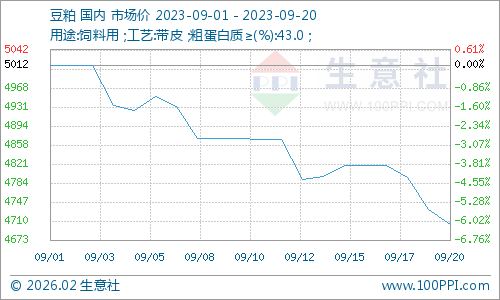 据生意社商品行情分析系统显示:9月开始,豆粕行情振荡下跌,价格接近6%。9月1日,豆粕市场均价5012元/吨,9月20日,豆粕市场均价4704元/吨,价格下跌6.15%。