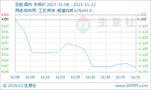 据生意社商品行情分析系统显示:11月8日开始,国内豆粕行情不断下行为主,跌幅超4%。11月8日,豆粕市场均价4350元/吨,11月22日,豆粕市场均价4164元/吨,下跌4.28%。