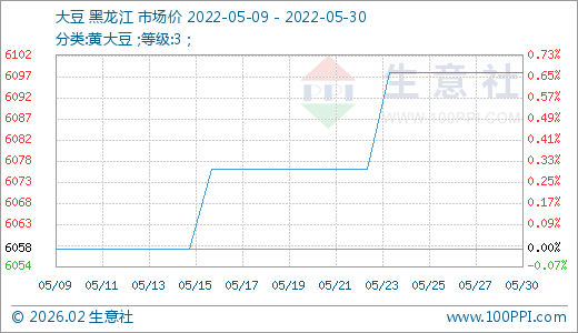 据生意社监测数据显示:5月中旬开始,国产大豆行情小幅上涨。截止5月30日,国产大豆市场均价6098元/吨,较5月9日上涨0.66%。