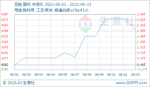 据生意社监测数据显示:6月开始,豆粕经过短暂盘整过后,行情呈现振荡上涨,上涨过后,行情迎来跳水。月初豆粕市场均价4262元/吨,6月13日,豆粕市场均价4348元/吨,价格上涨2.02%。