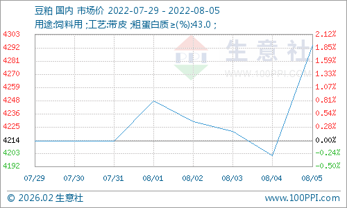 据生意社数据监测显示:8月5日,豆粕市场均价4294元/吨,较7月末价格上涨1.9%,利多支撑,国内豆粕行情上涨,单日上涨2.19%。外盘巴西大豆压榨量创历史新高,带动国内豆粕期货行情上涨,加上天气炎热,大豆油厂停机检修增加,豆粕现货行情跟涨,主流价格突破4200元大关。