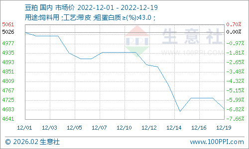 据生意社监测数据显示:12月开始,终端饲料需求转淡,进口大豆到港数量增加,多重利空打压,豆粕行情持续下跌,跌了半个多月。截止12月19日,豆粕市场均价4686元/吨,较月初下跌6.76%。
